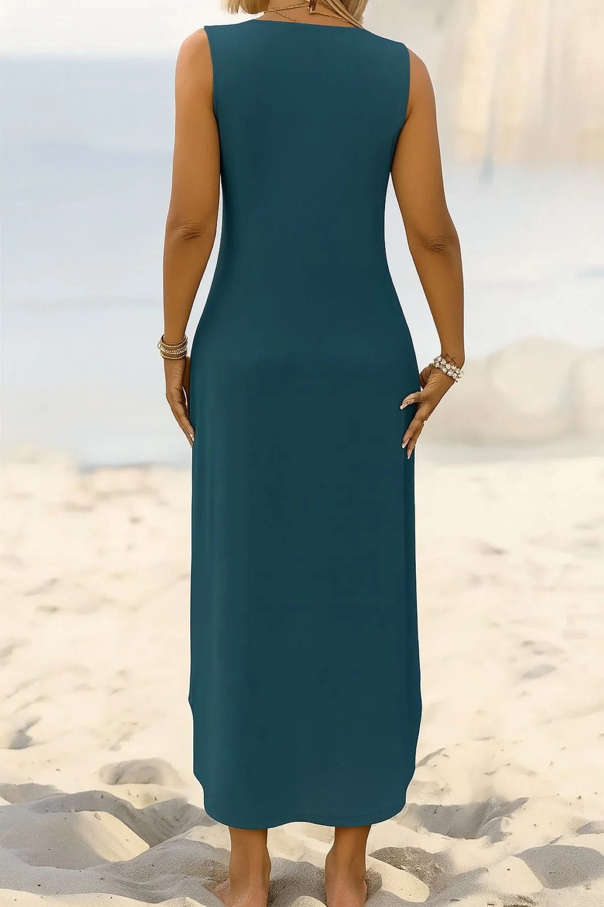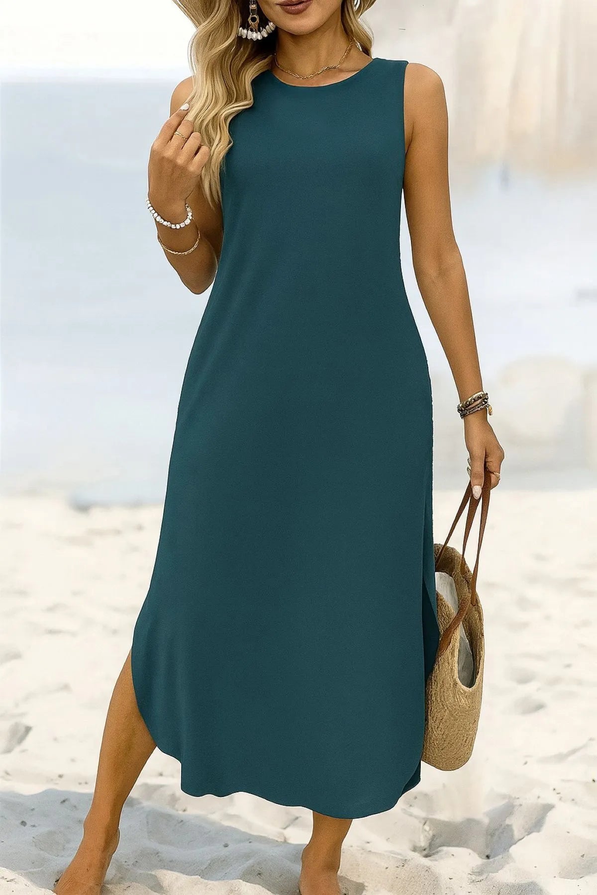 Kadın Eteği Oval Yırtmaçlı Sıfır Kol Viskon Midi Boy Elbise - Petrol