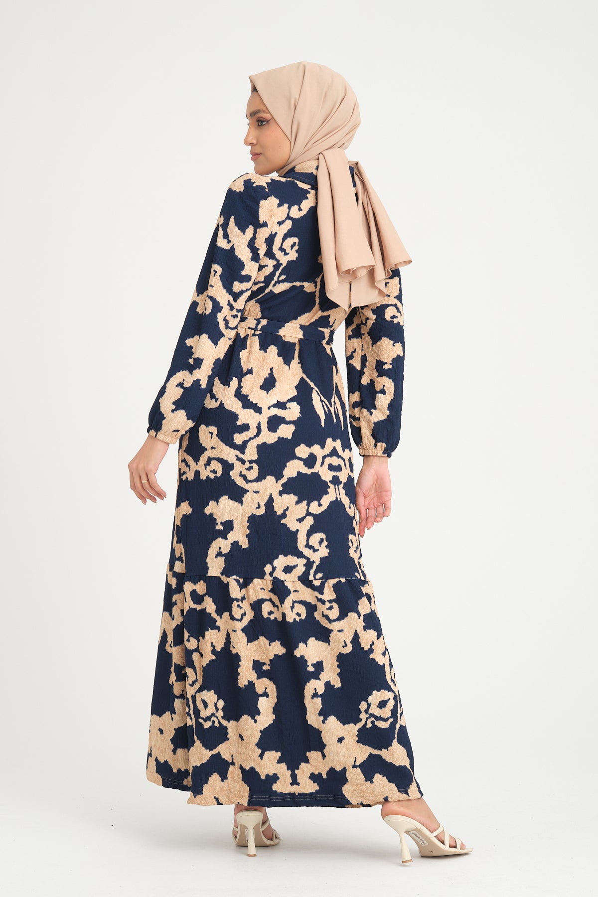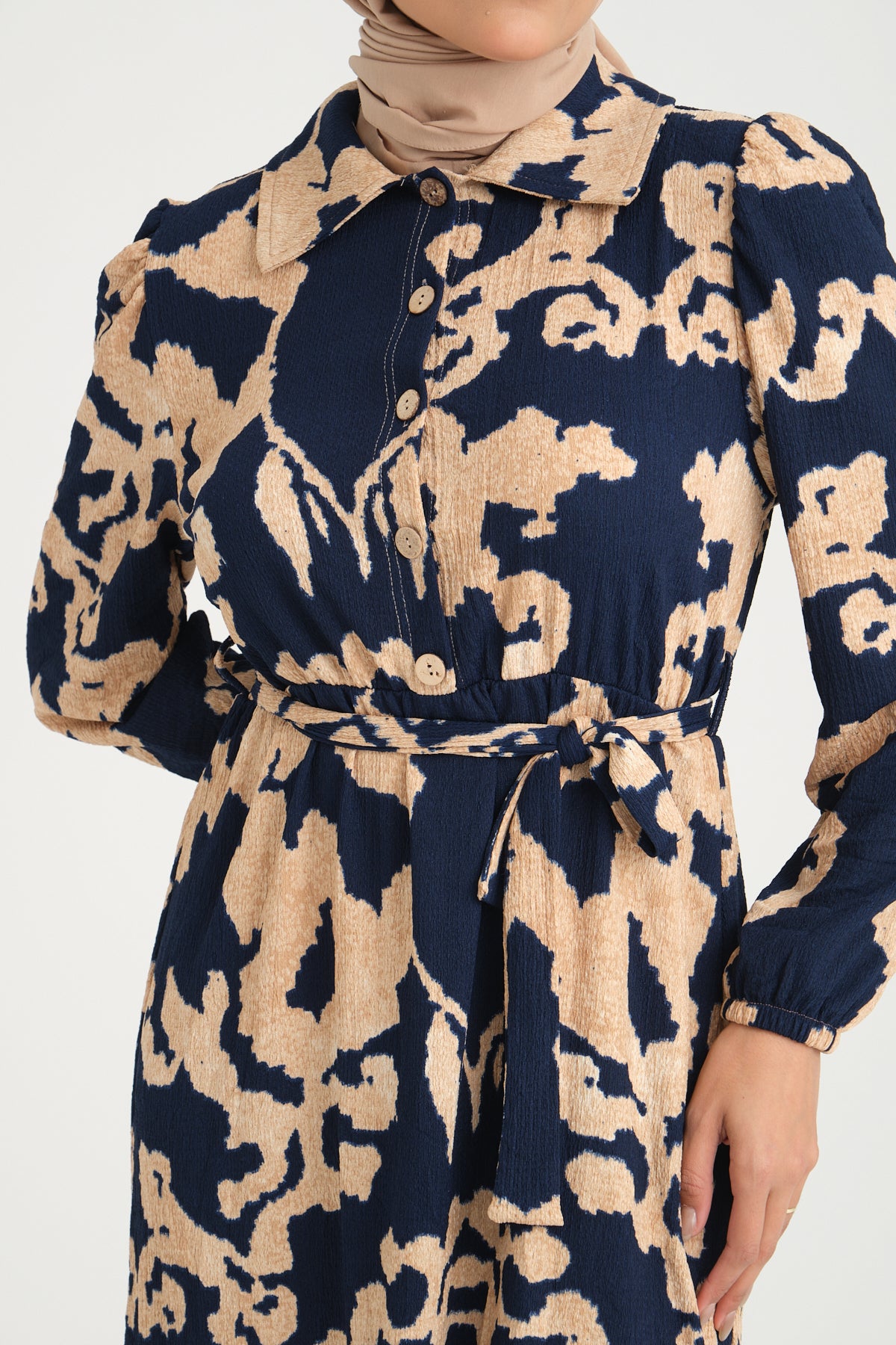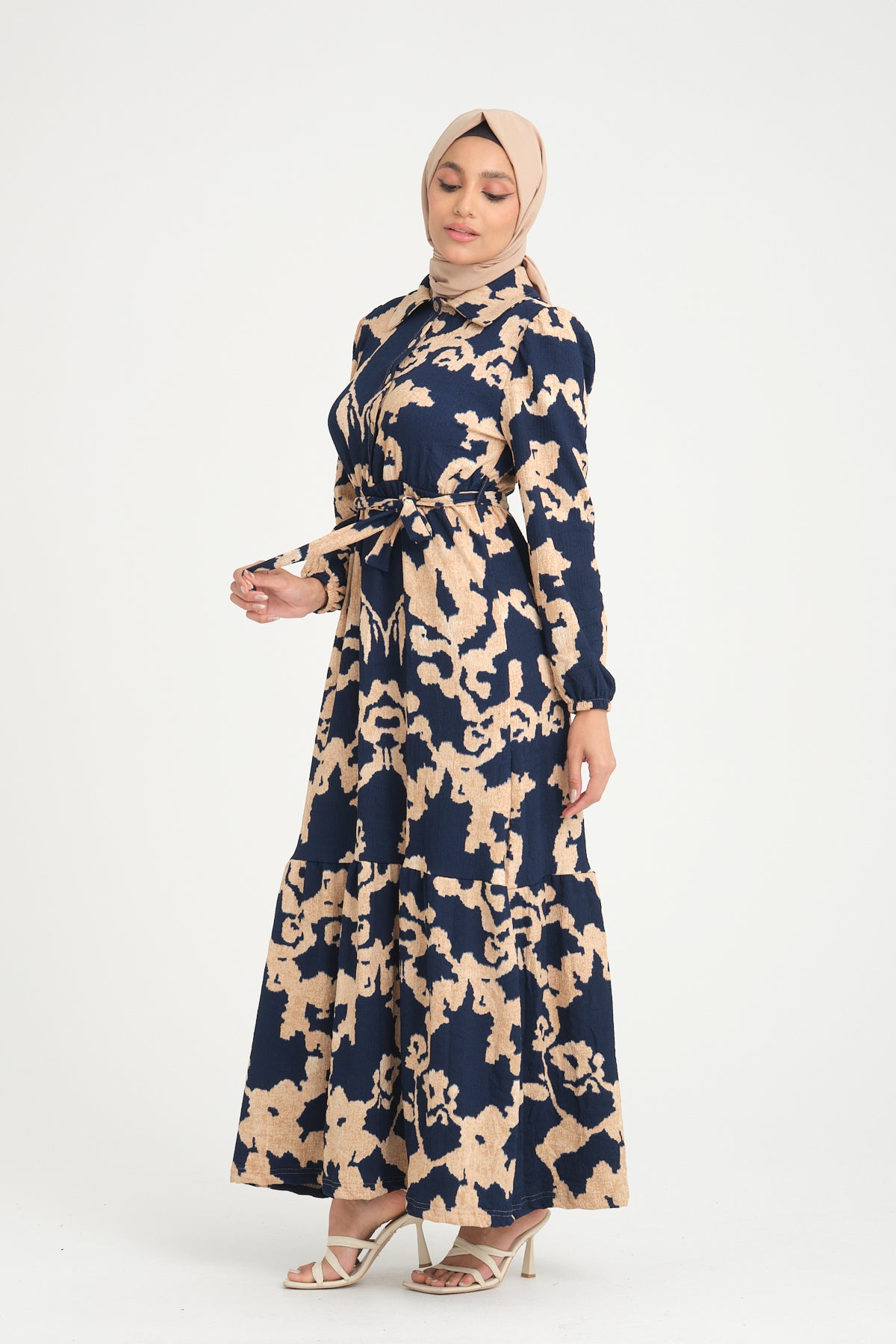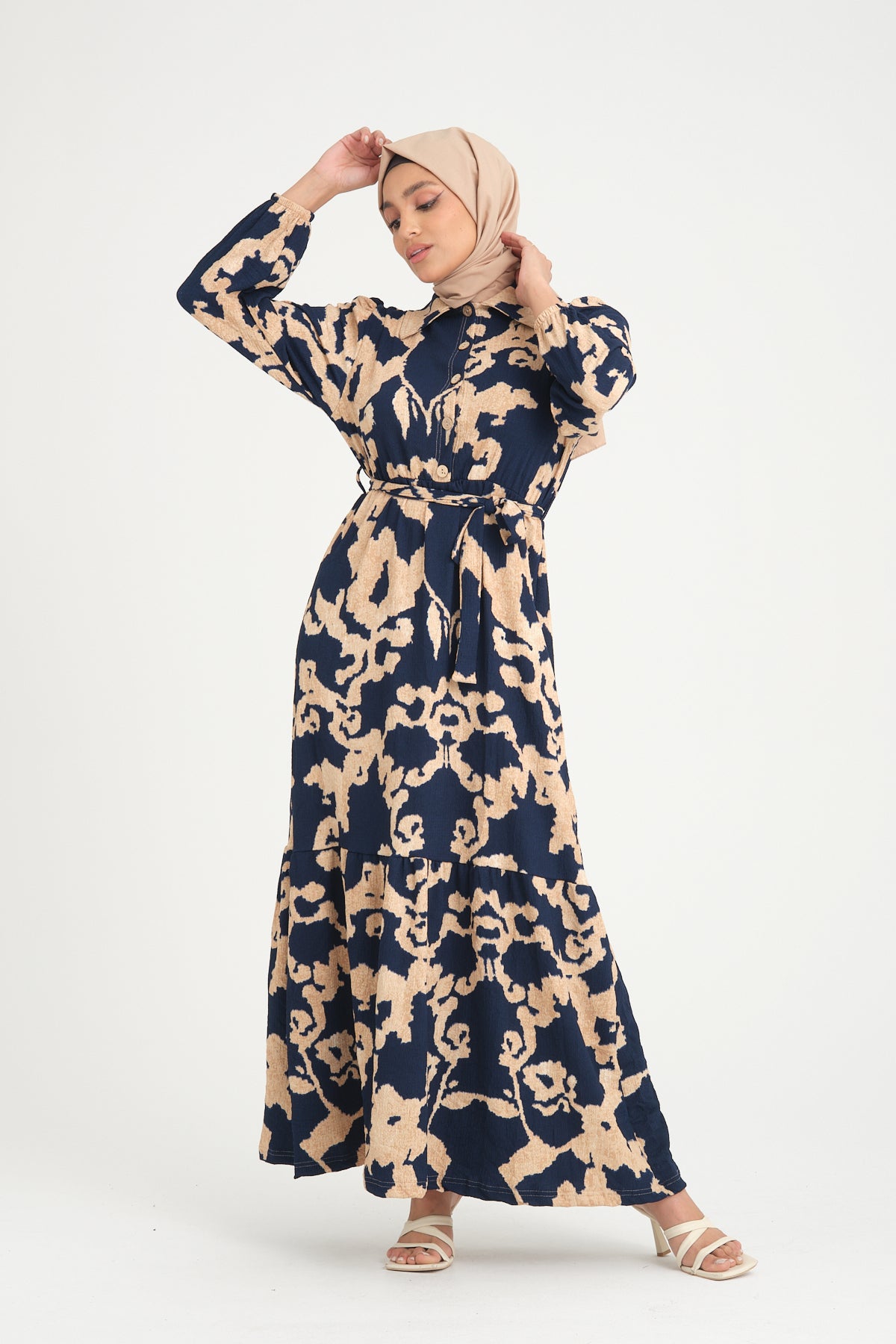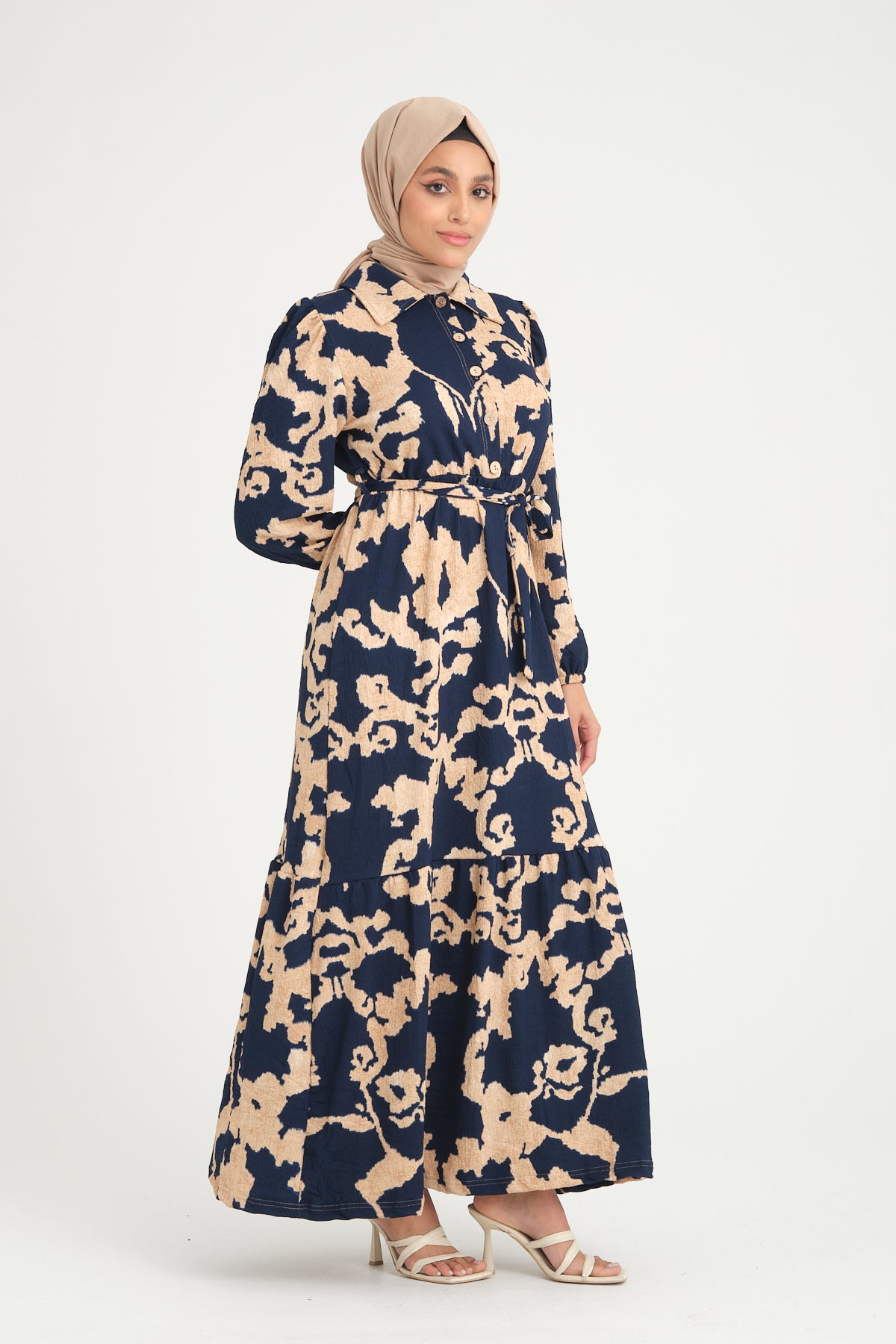 Kadın Metraj Baskılı Dokuma Krep Yakalı Uzun Elbise - Lacivert