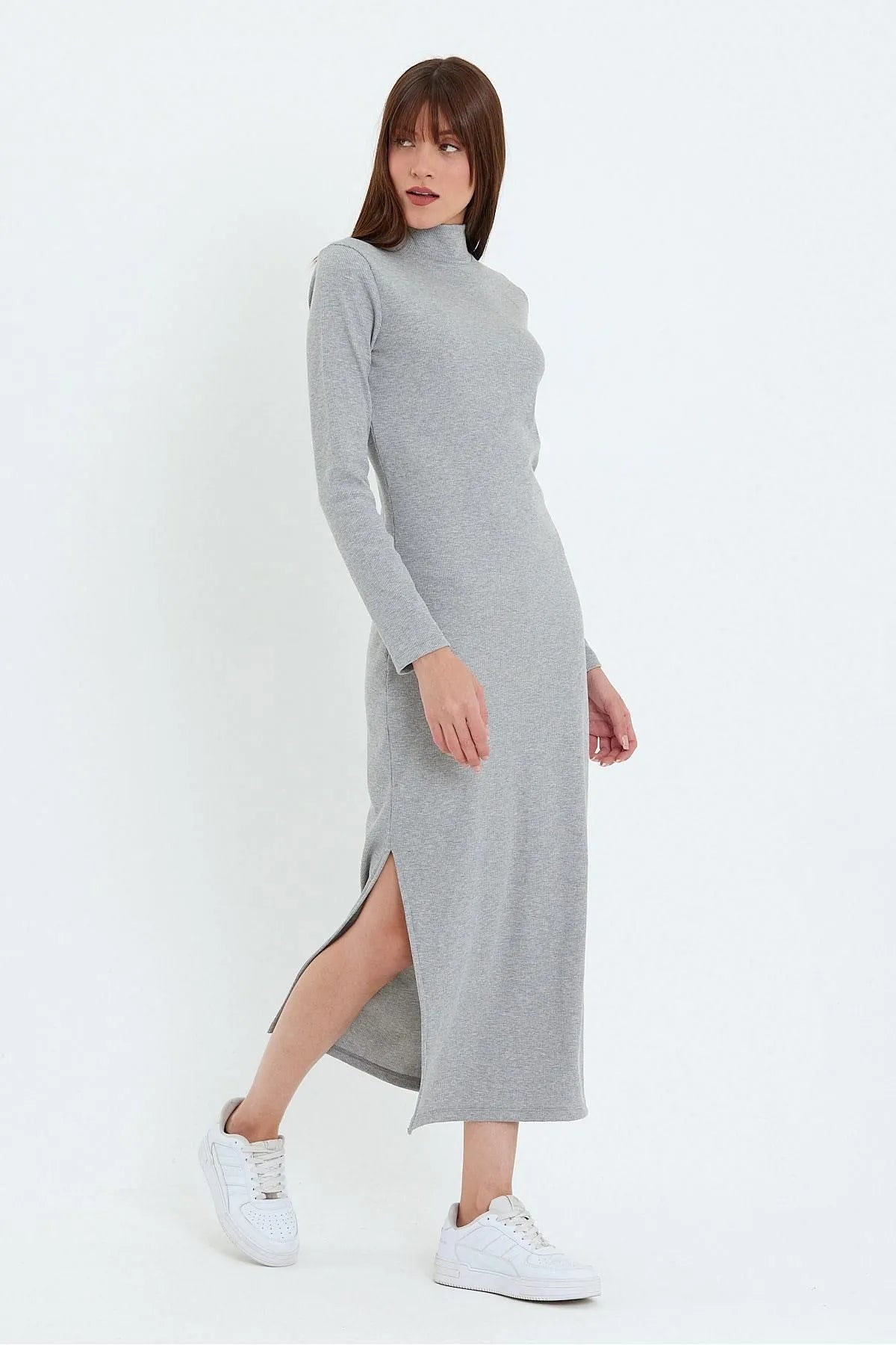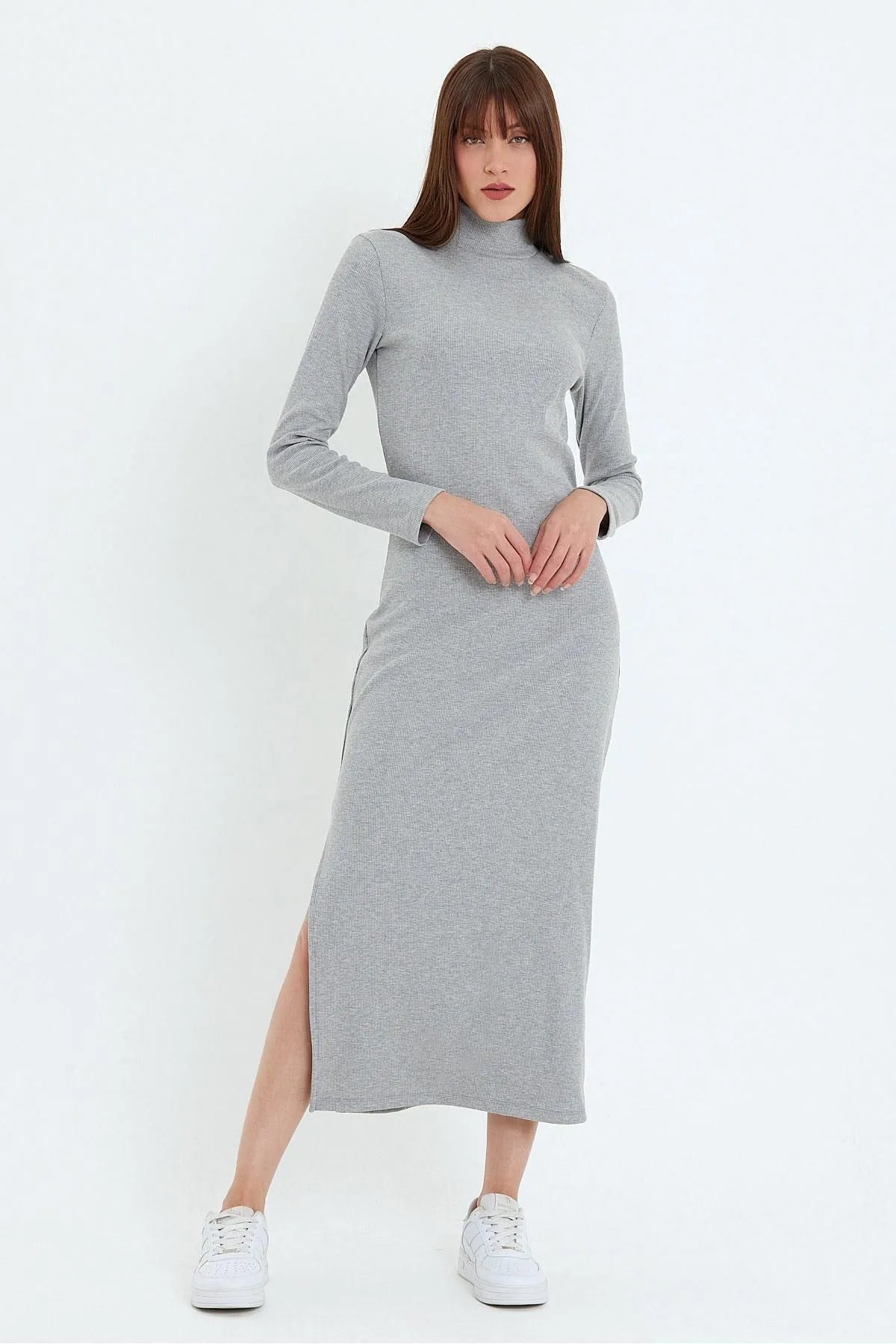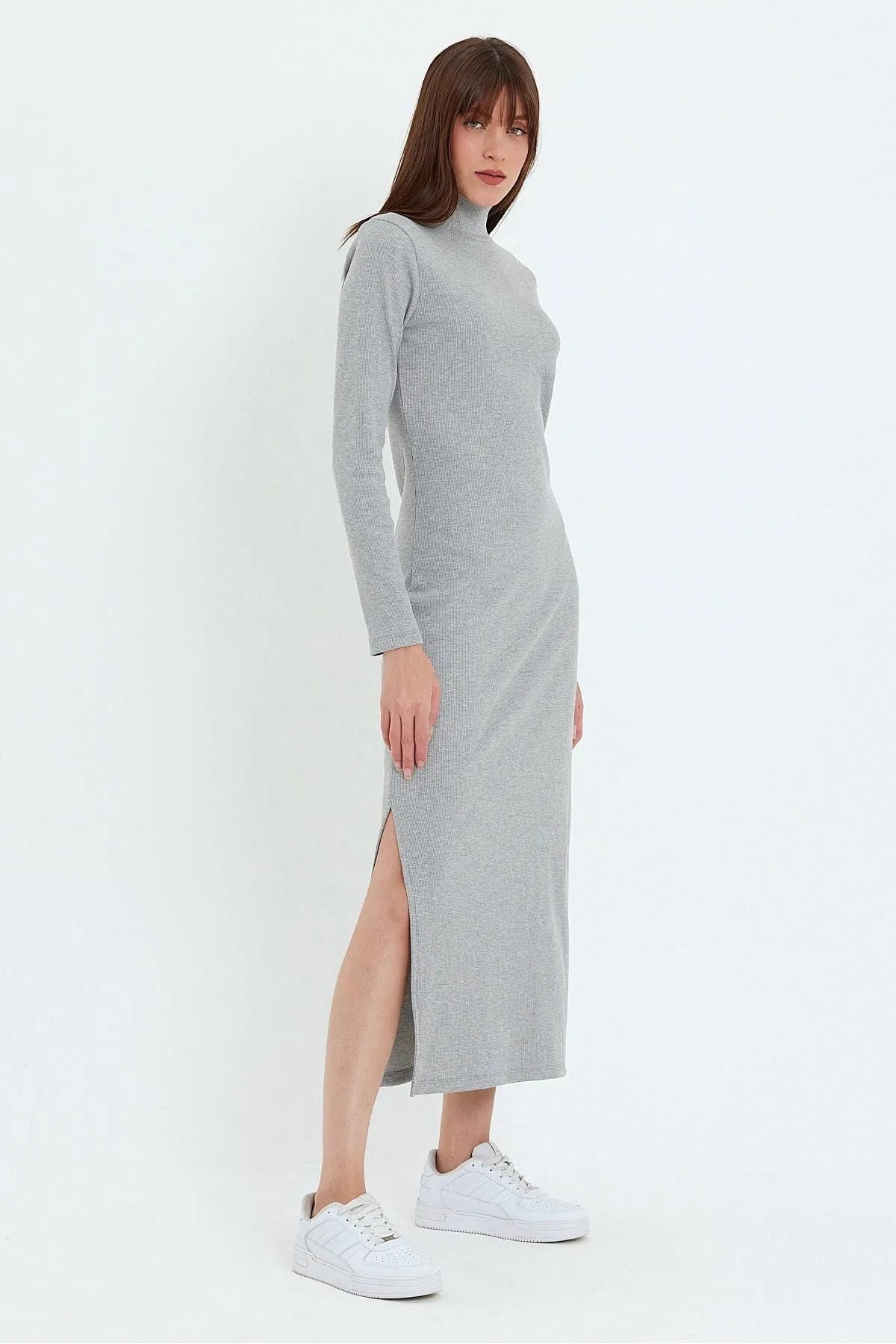 Kaşkorse Balıkçı Yaka Yırtmaçlı Örme Uzun Elbise - Gri