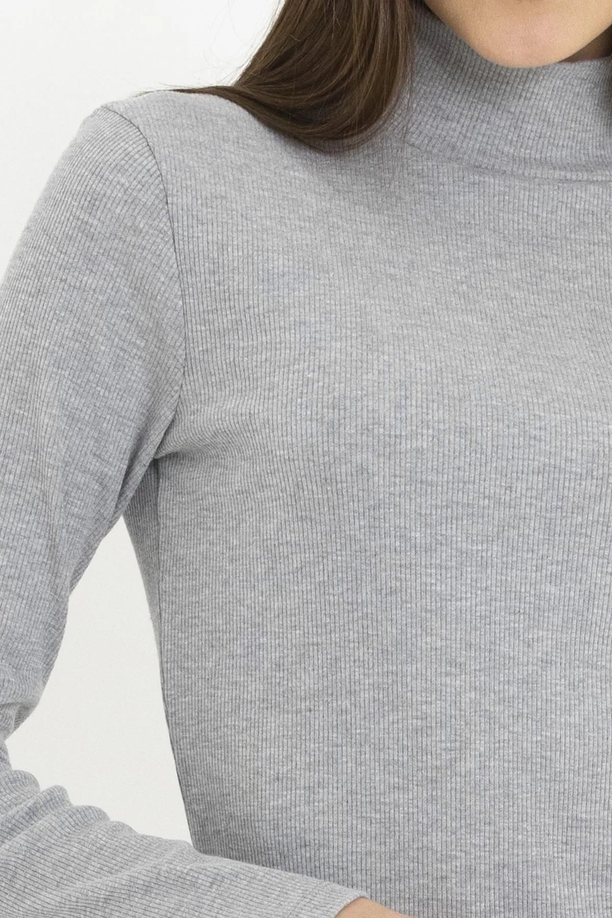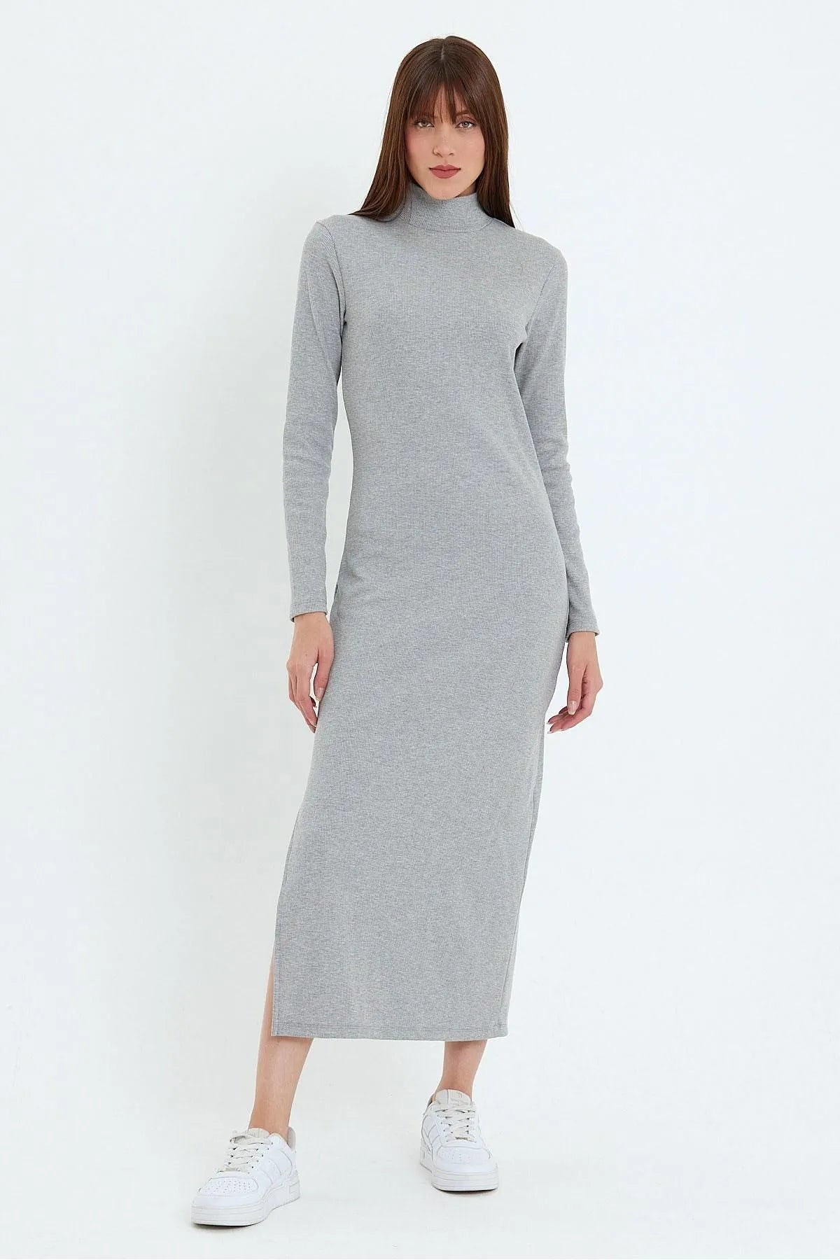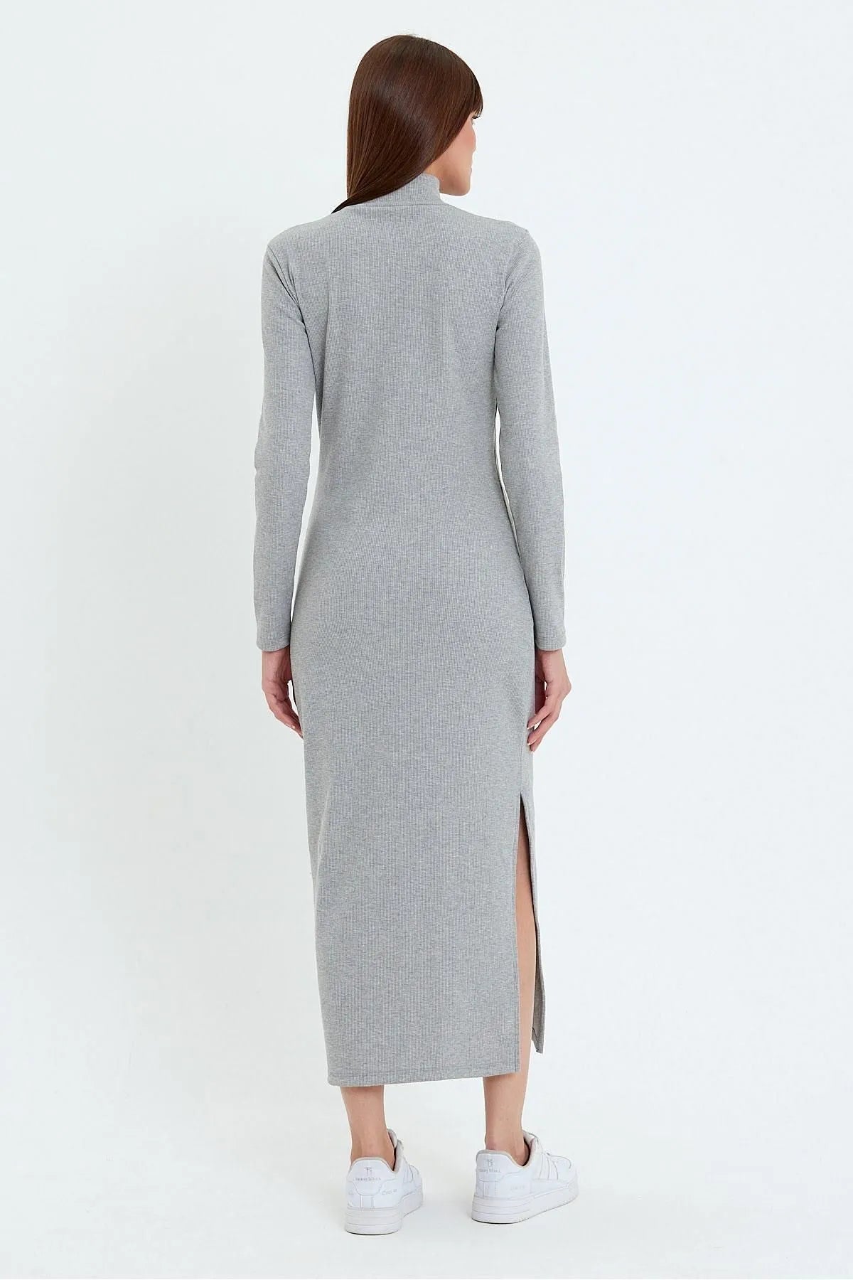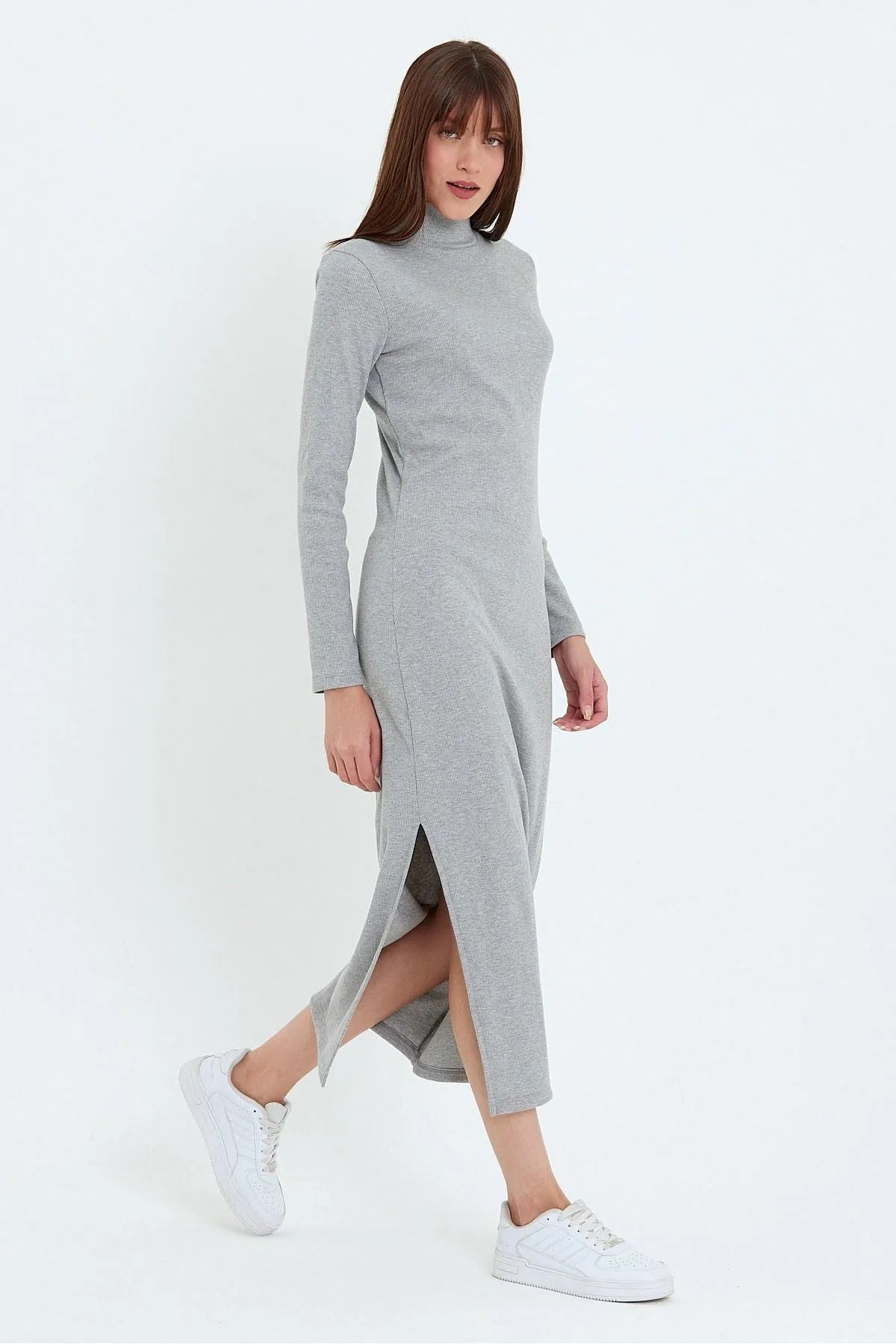 Kaşkorse Balıkçı Yaka Yırtmaçlı Örme Uzun Elbise - Gri
