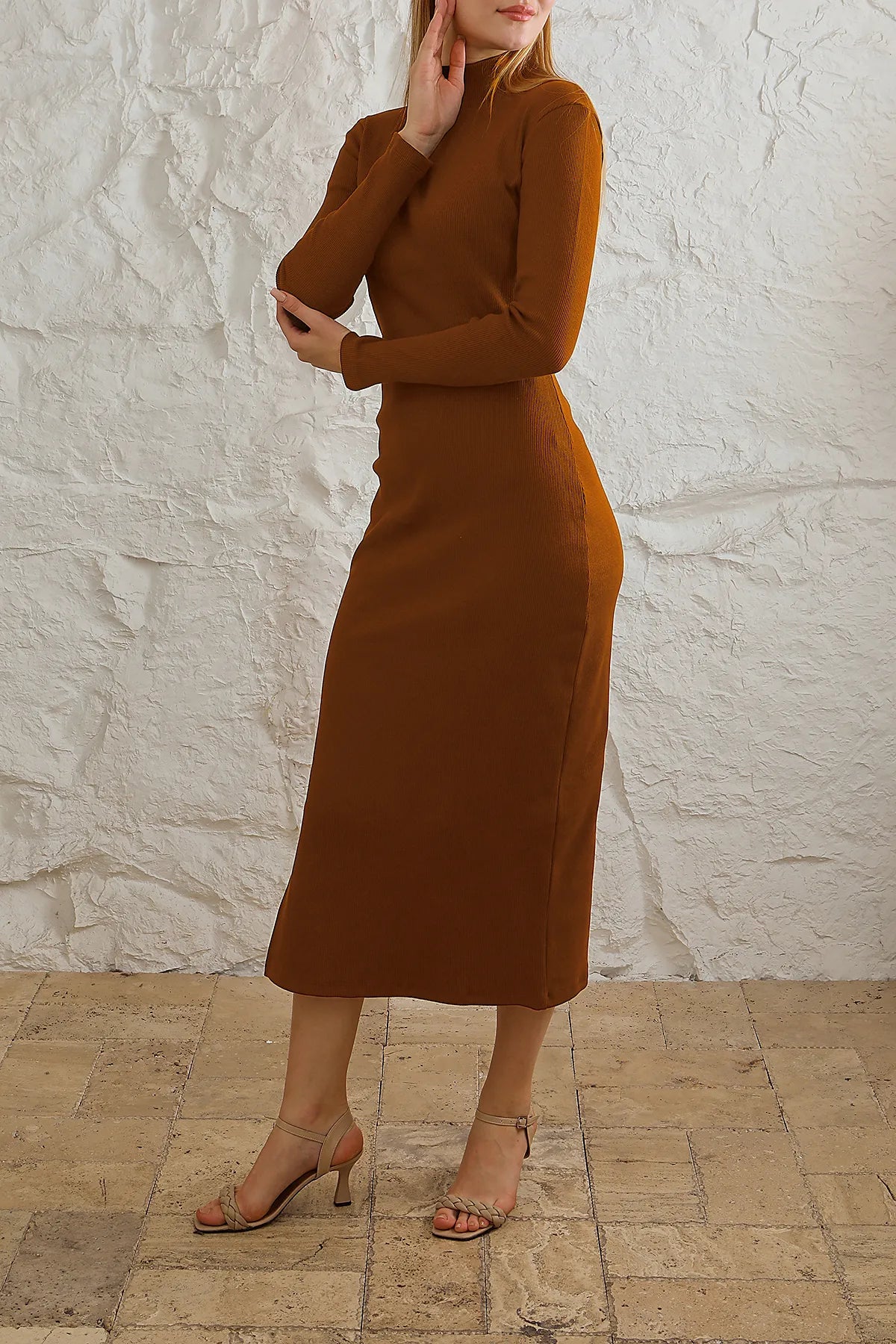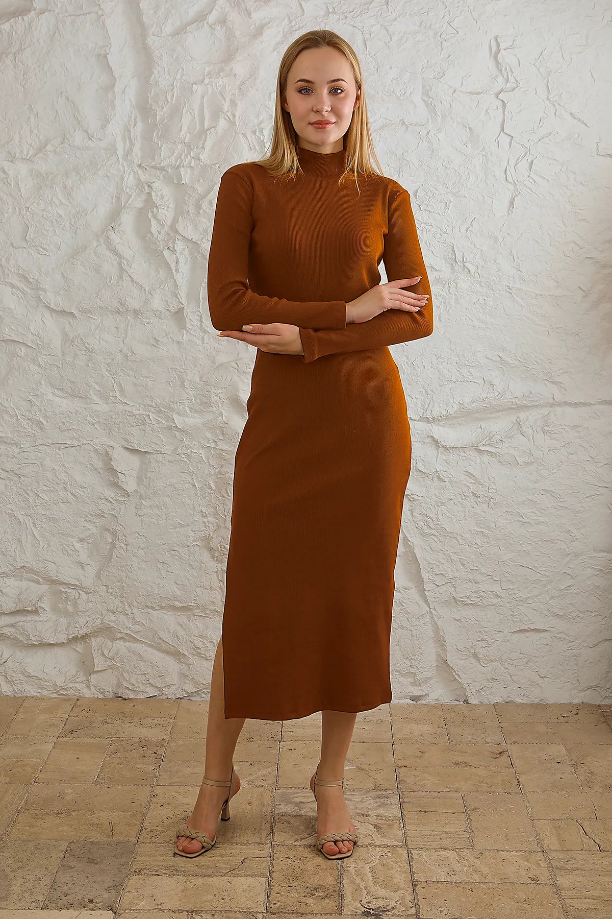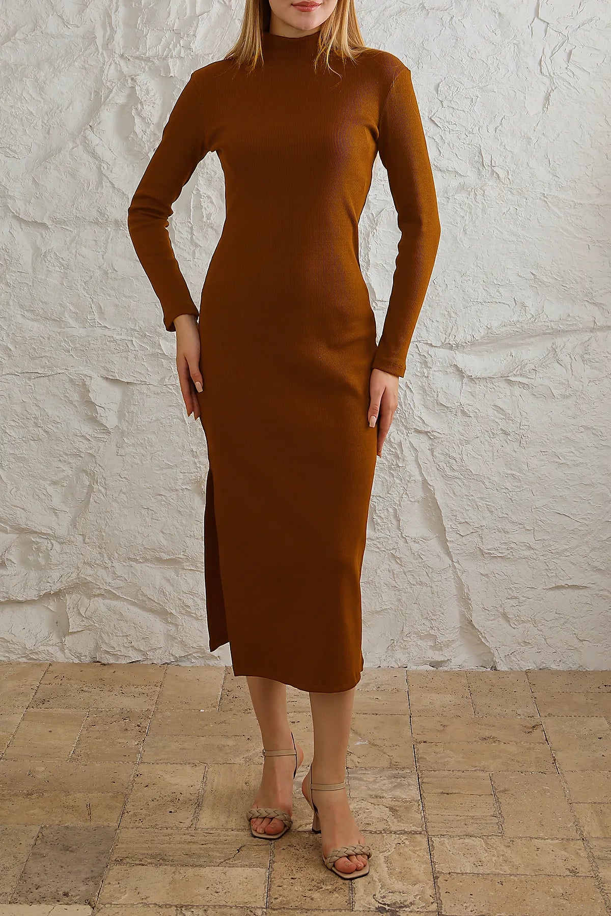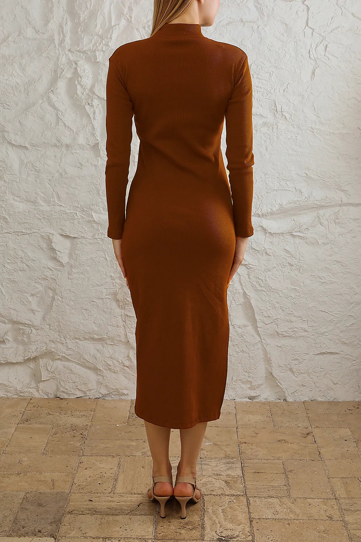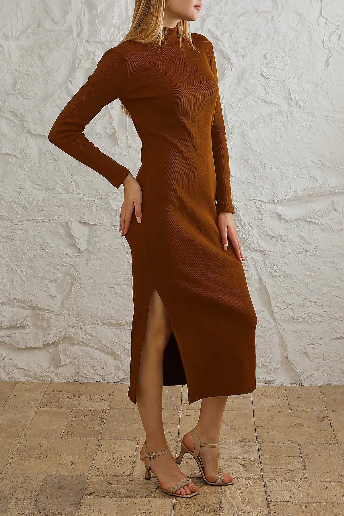 Kaşkorse Balıkçı Yaka Yırtmaçlı Örme Uzun Elbise - Kahverengi